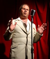 A fat, bald man with long greying hair in a jade shirt opened just above the navel revealing a plastic cross and strands of grey hair wearing black Sta-Prest trousers and battered old trainers looked over his bulky black sunglasses and began to murder It’s Not Unusual.